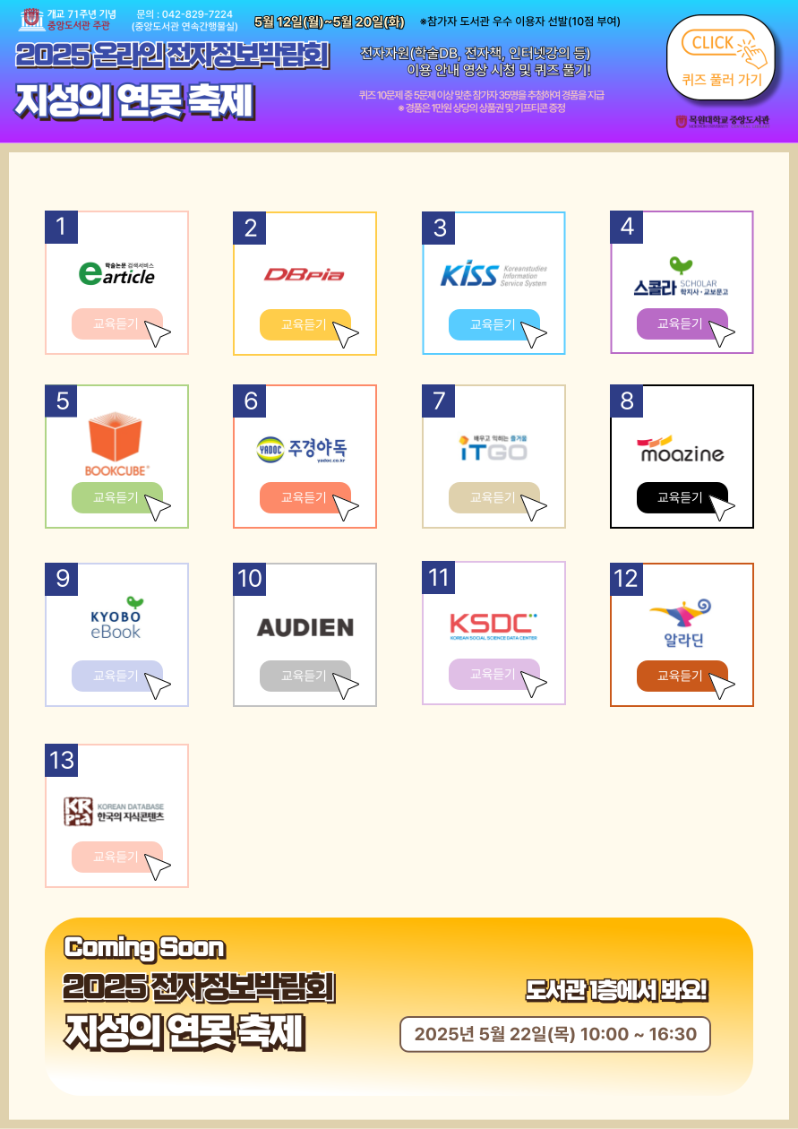 퀴즈 링크 earticle DBpia KISS 교보스콜라 북큐브 주경야독 ITGO 모아진 교보전자책 오디오북 KSDC 알라딘 KRpia